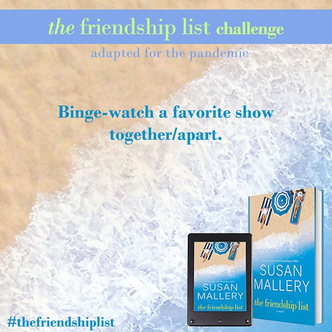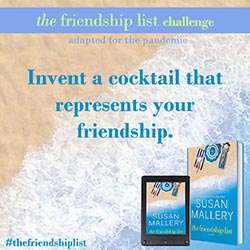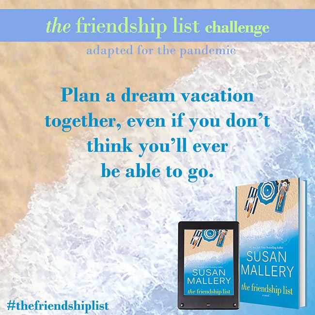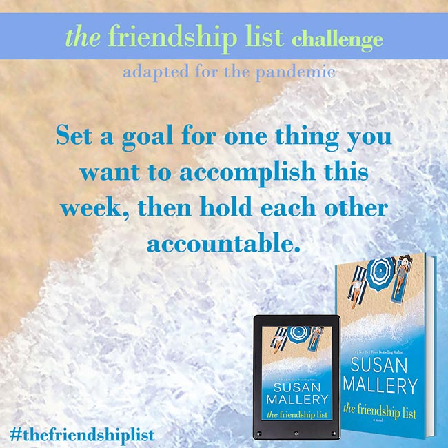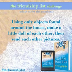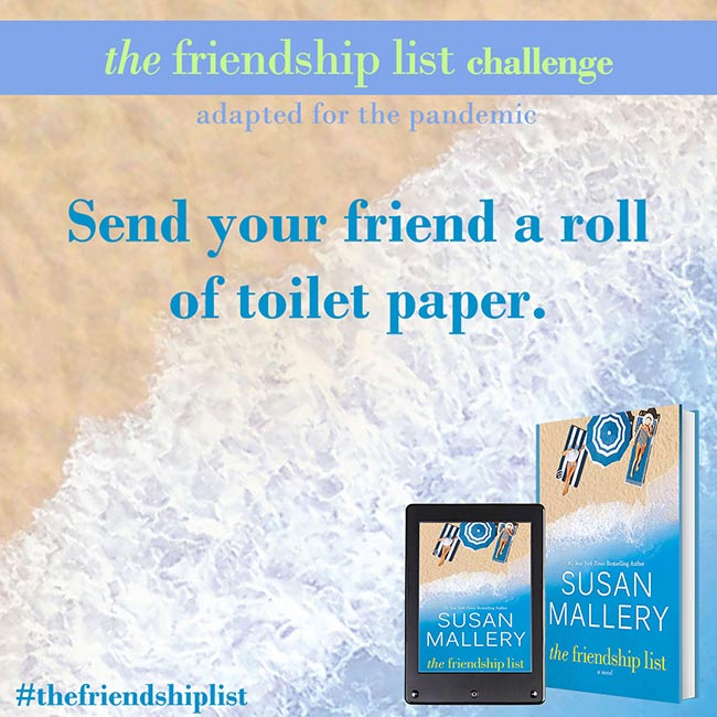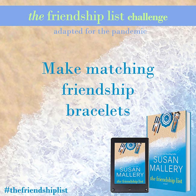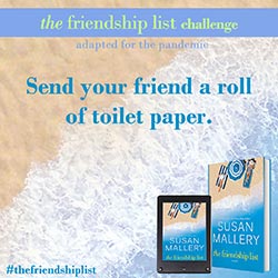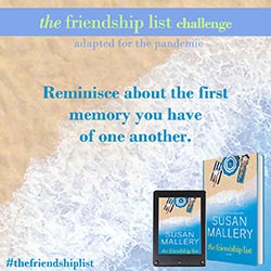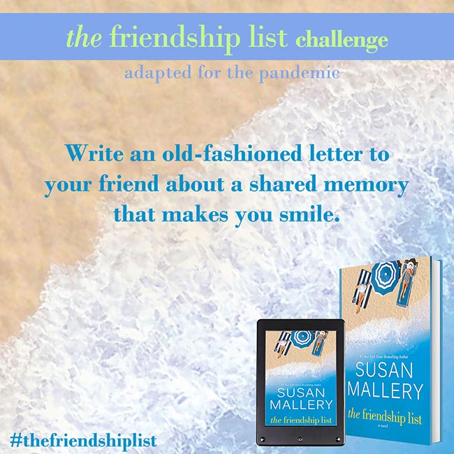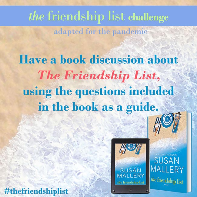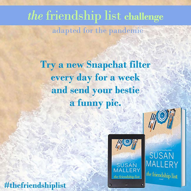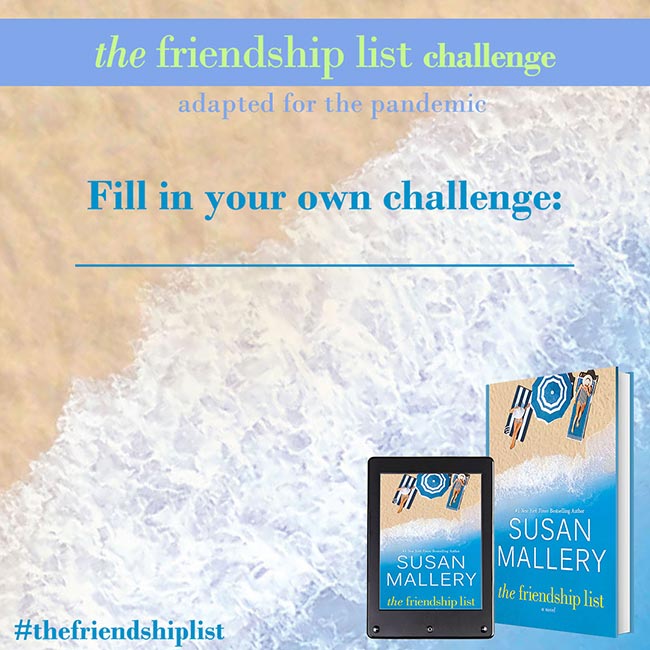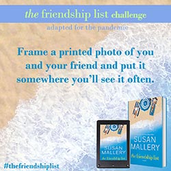 The Friendship List is a celebration of friendship, so Susan Mallery wants to help you and your best friends find creative and fun ways to connect with each other and make lasting memories. Complete two or more challenges to get on The Friendship List Challenge Wall of Fame. Submit a picture for a chance to be featured on Susan’s social media. If Susan features you, she’ll send you some fun swag!